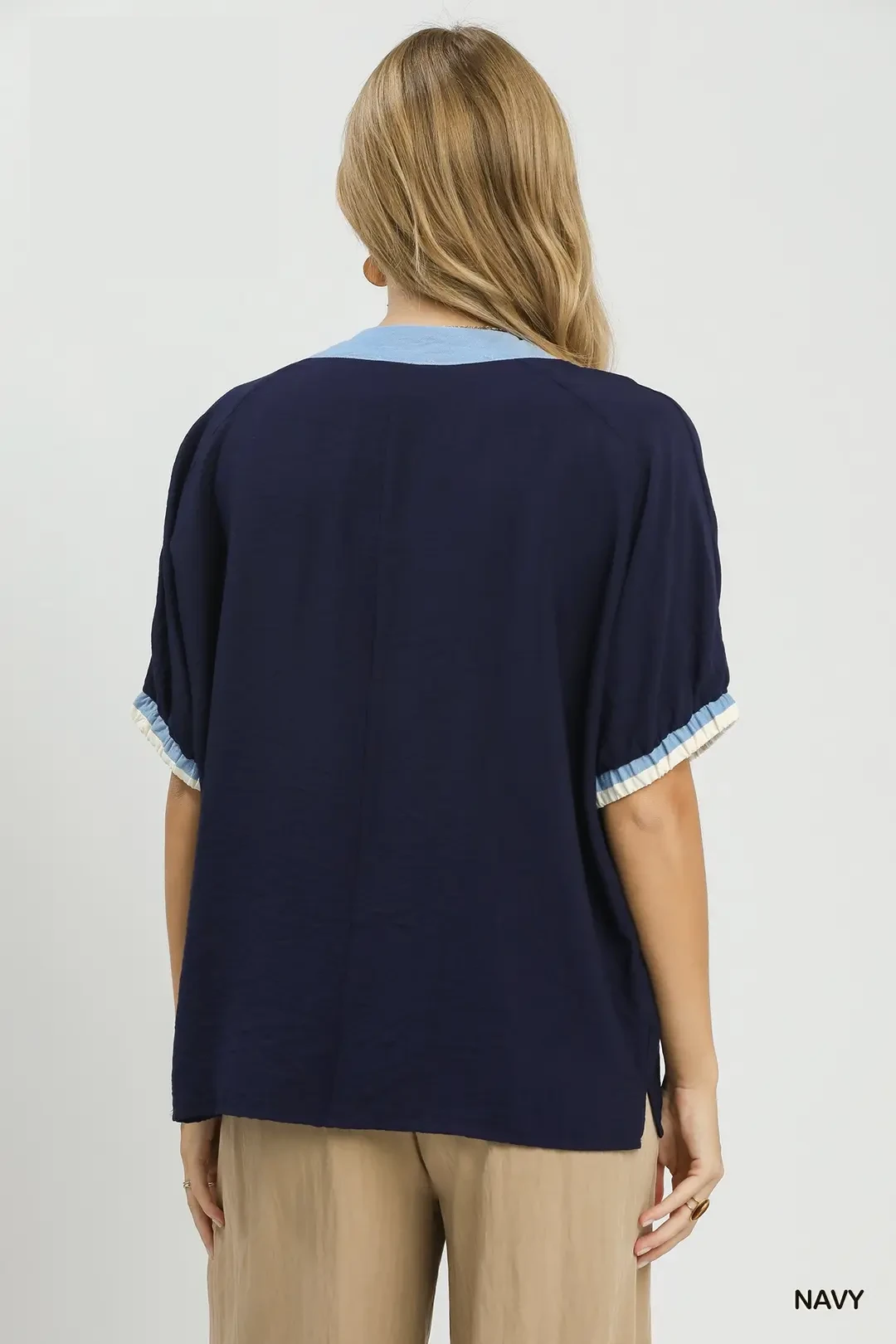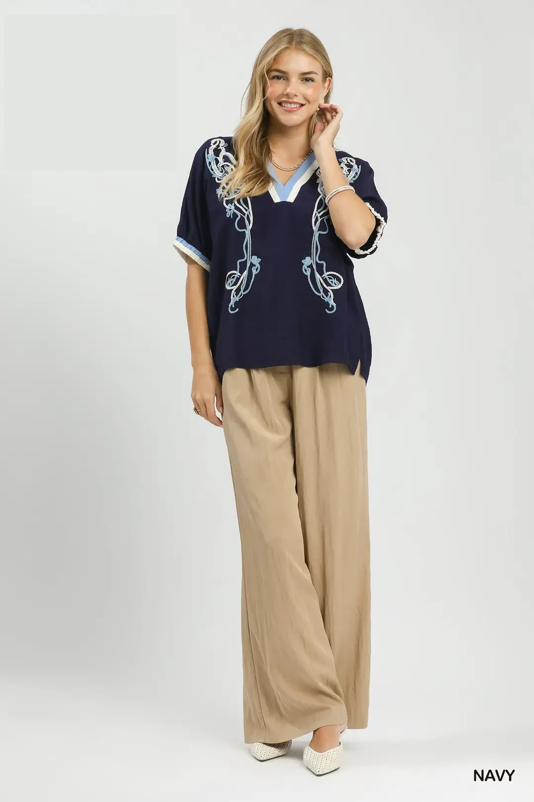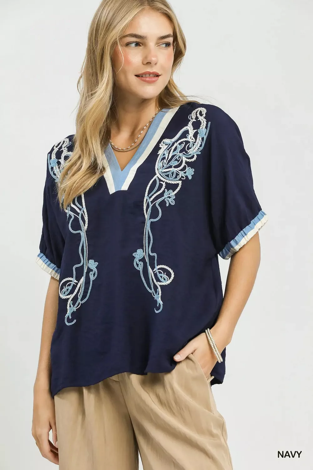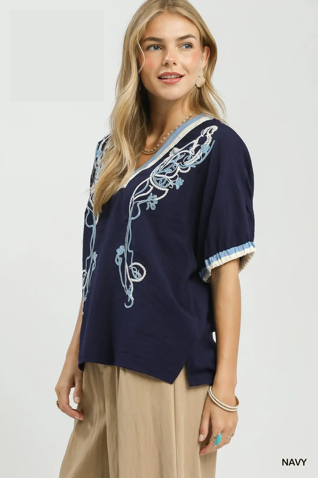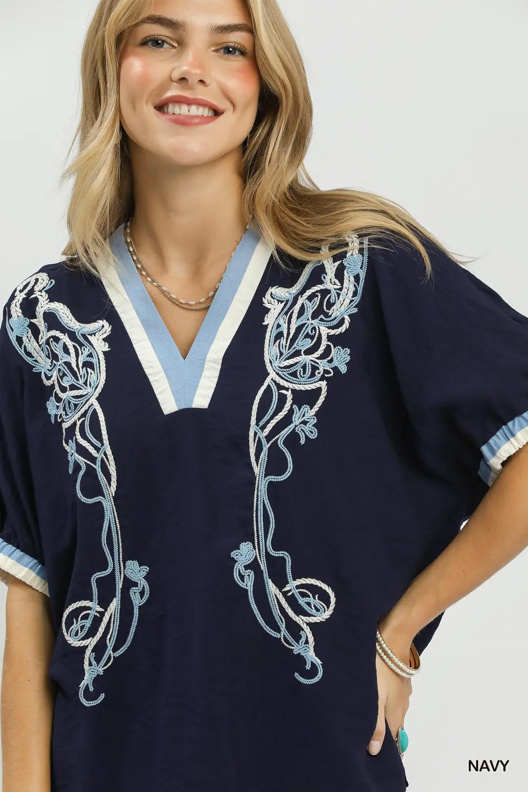 Umgee Embroidered Floral V-Neck Short Sleeve Blouse with Contrast Trim