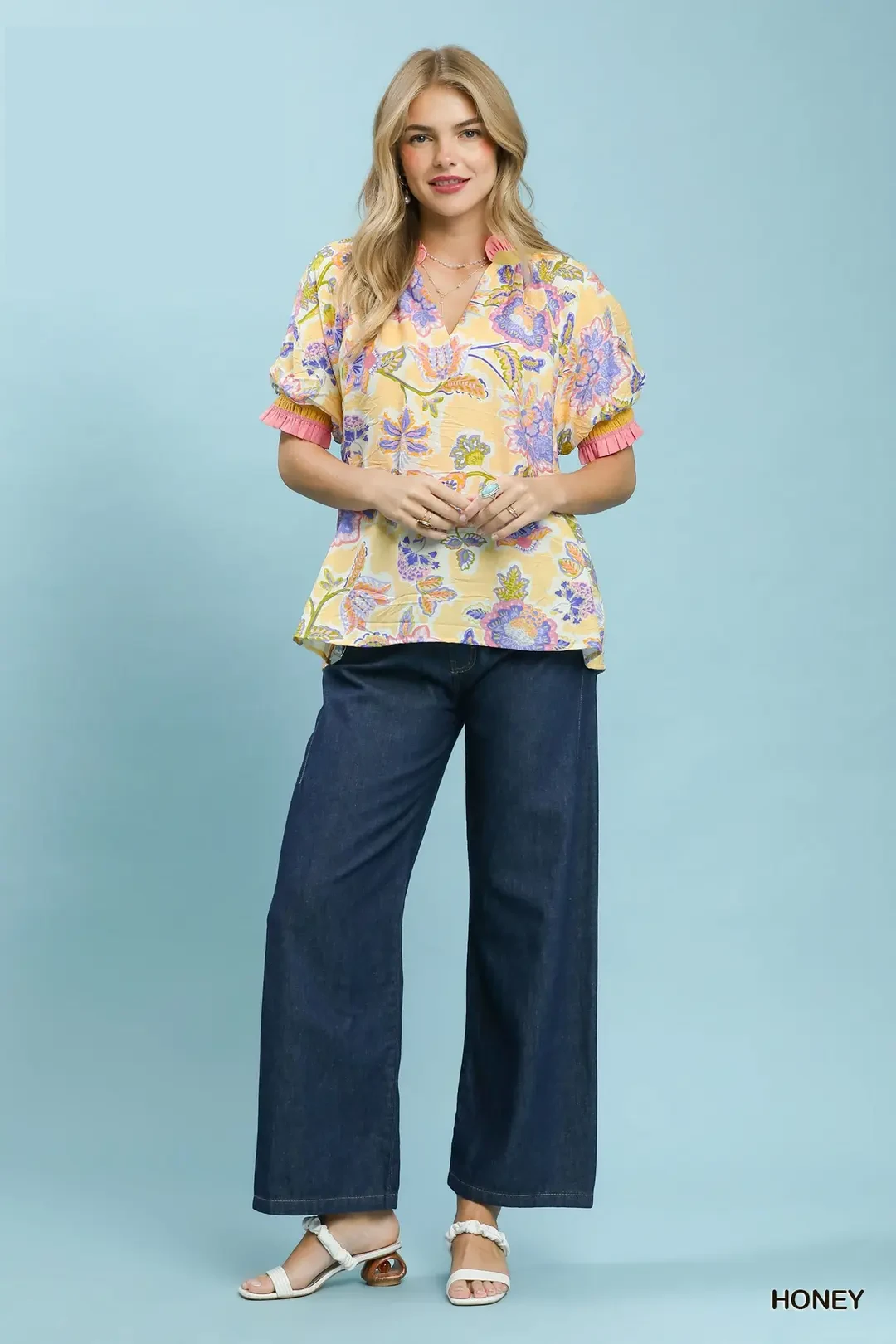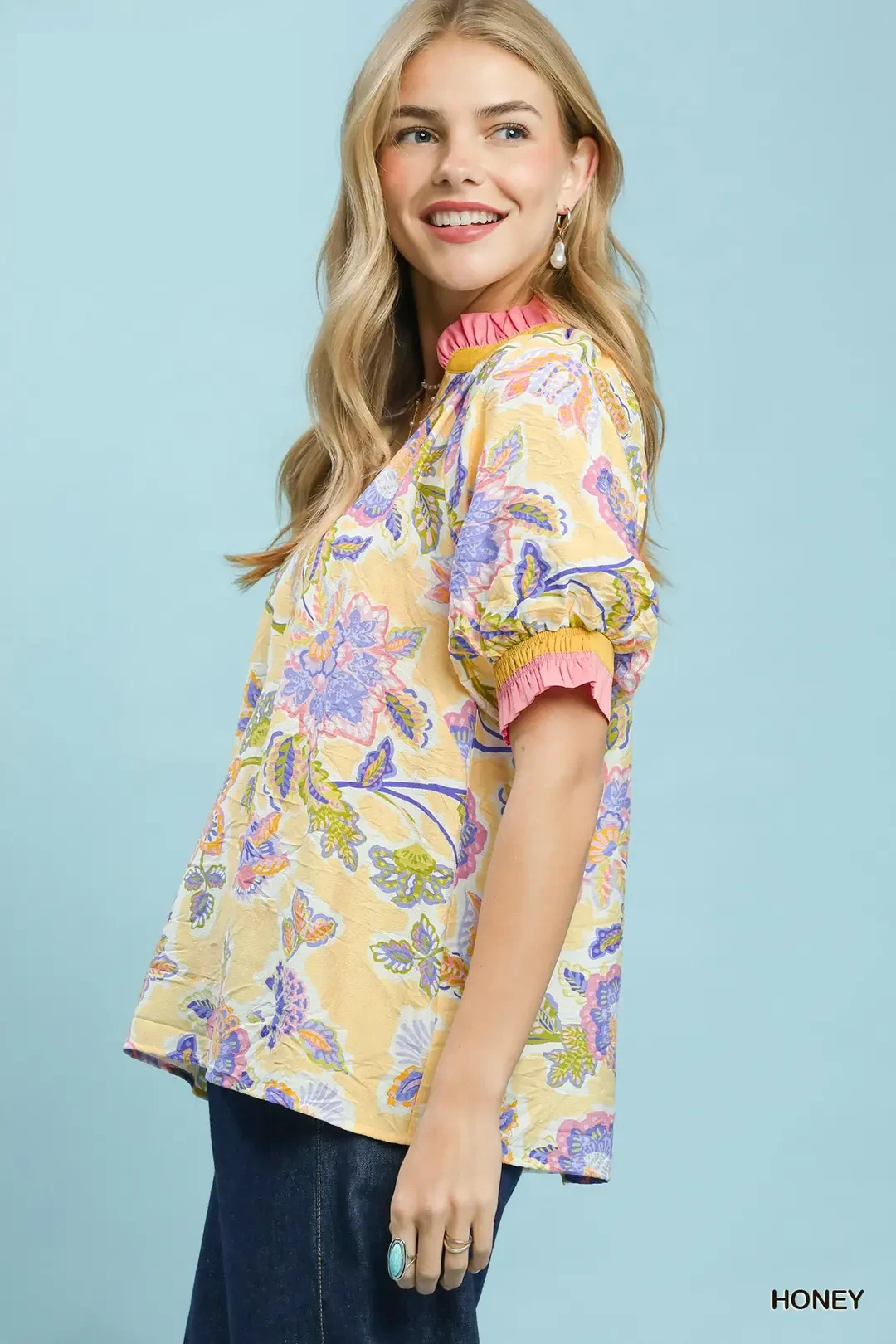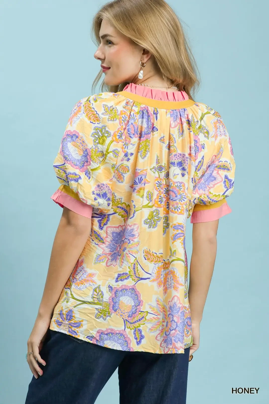 Umgee Floral Print Ruffled Short Sleeve Top