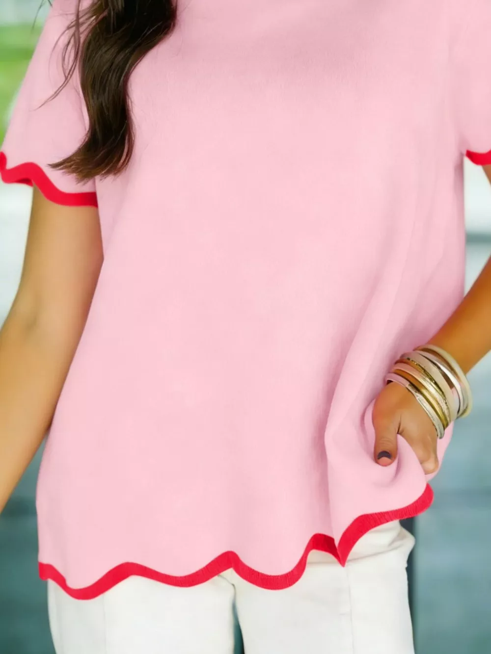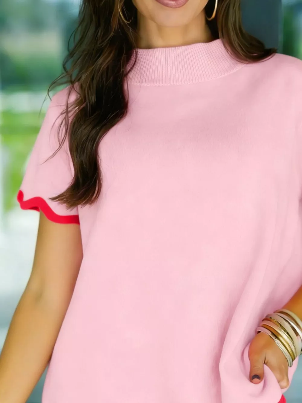 Stand Neck Contrast Wavy Trim Short Sleeve Sweater