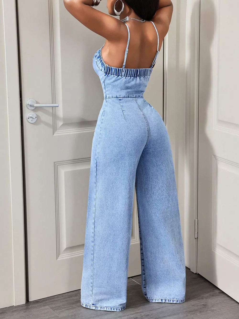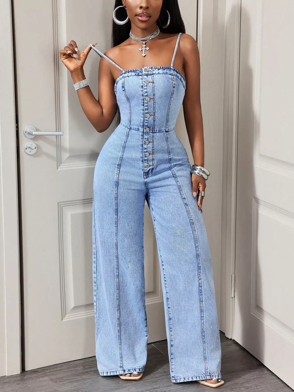 Button-Down Wide Leg Denim Jumpsuit