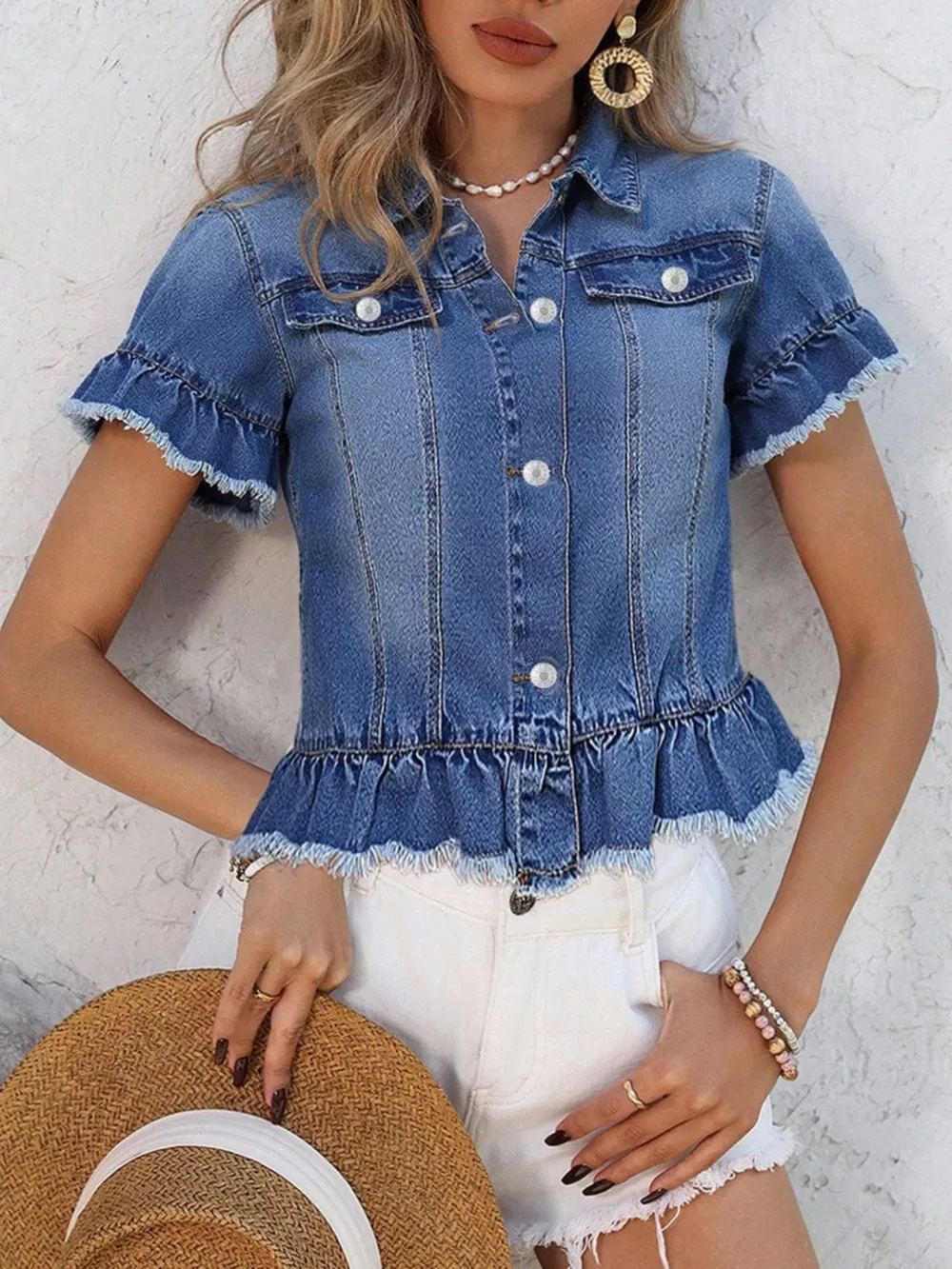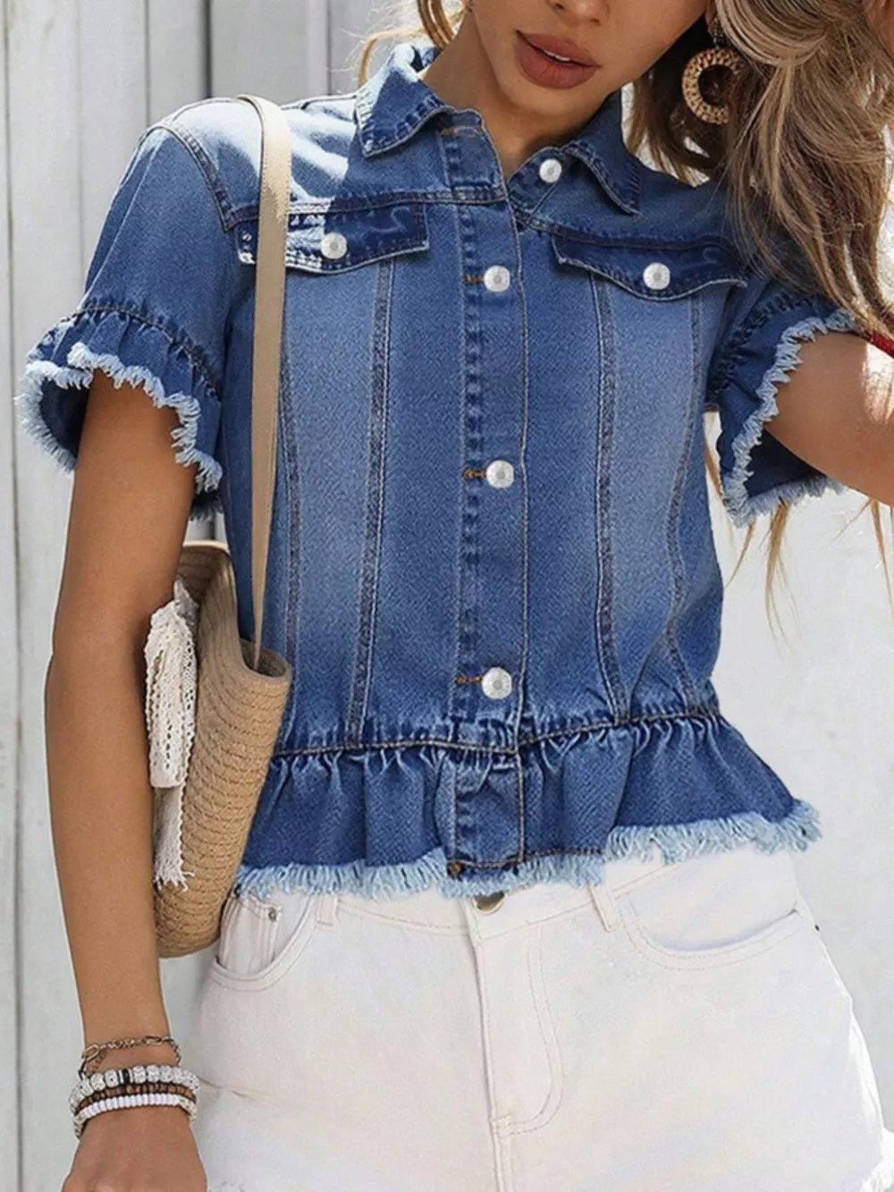 • Features:Buttoned,Raw Hem,Ruffled