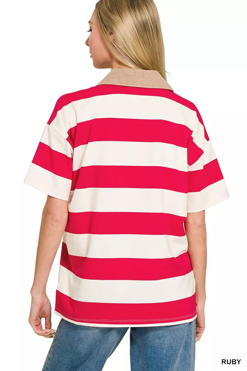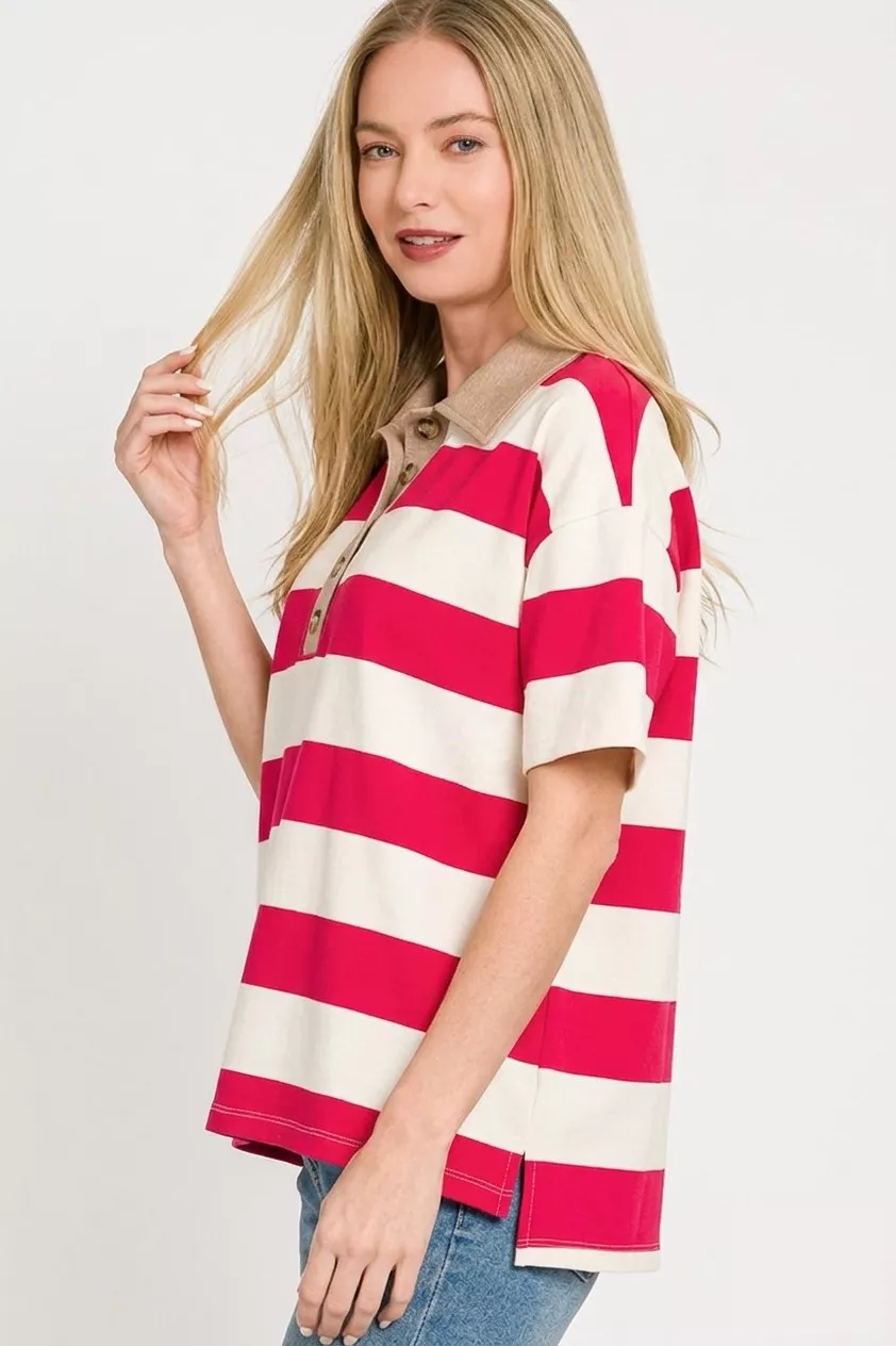 This striped collared polo top delivers classic casual style with timeless everyday appeal. Designed with a structured collared neckline and iconic polo silhouette, it balances neat refinement and laid-back comfort. The trendy striped pattern adds subtle visual depth and effortless versatility, while the relaxed cut ensures breathable, all-day wear. Clean and minimalist, it easily pairs with shorts, jeans, and casual bottoms for daily errands, weekend outings, and casual daily looks.