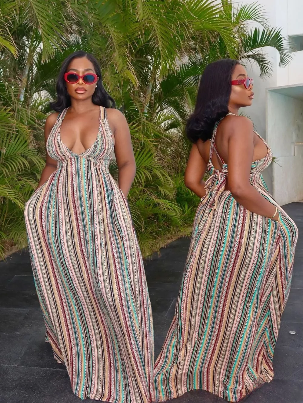 Striped Deep V-Neck Maxi Dress