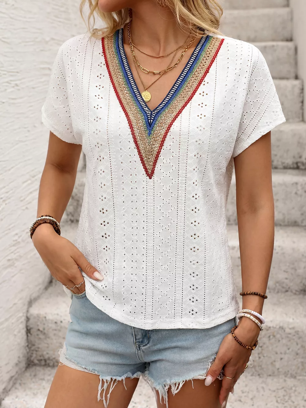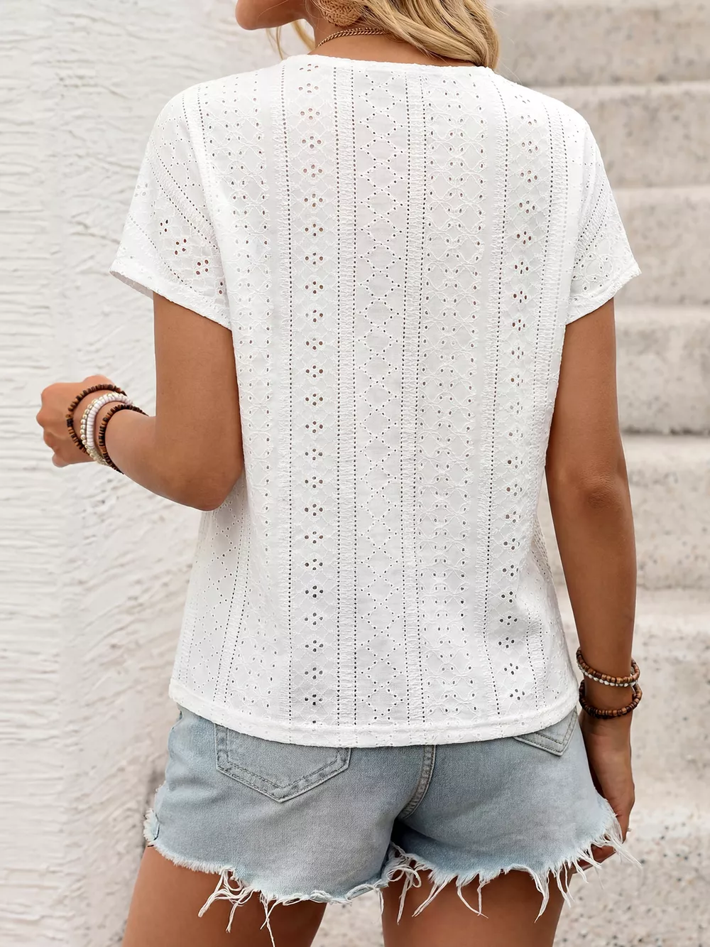 Eyelet V-Neck Short Sleeve Top