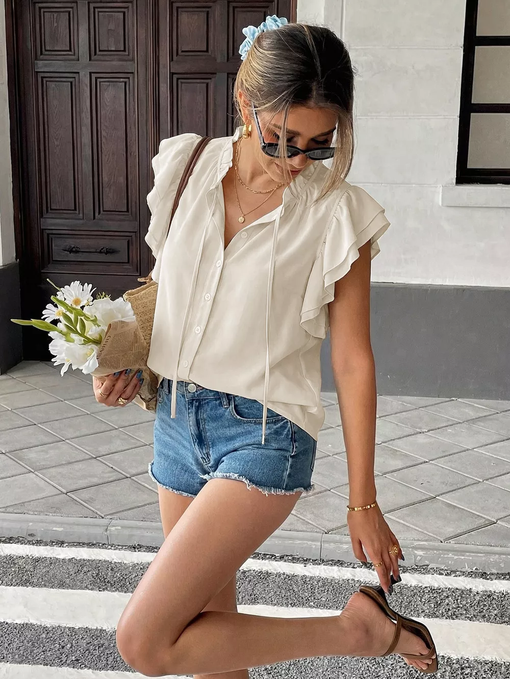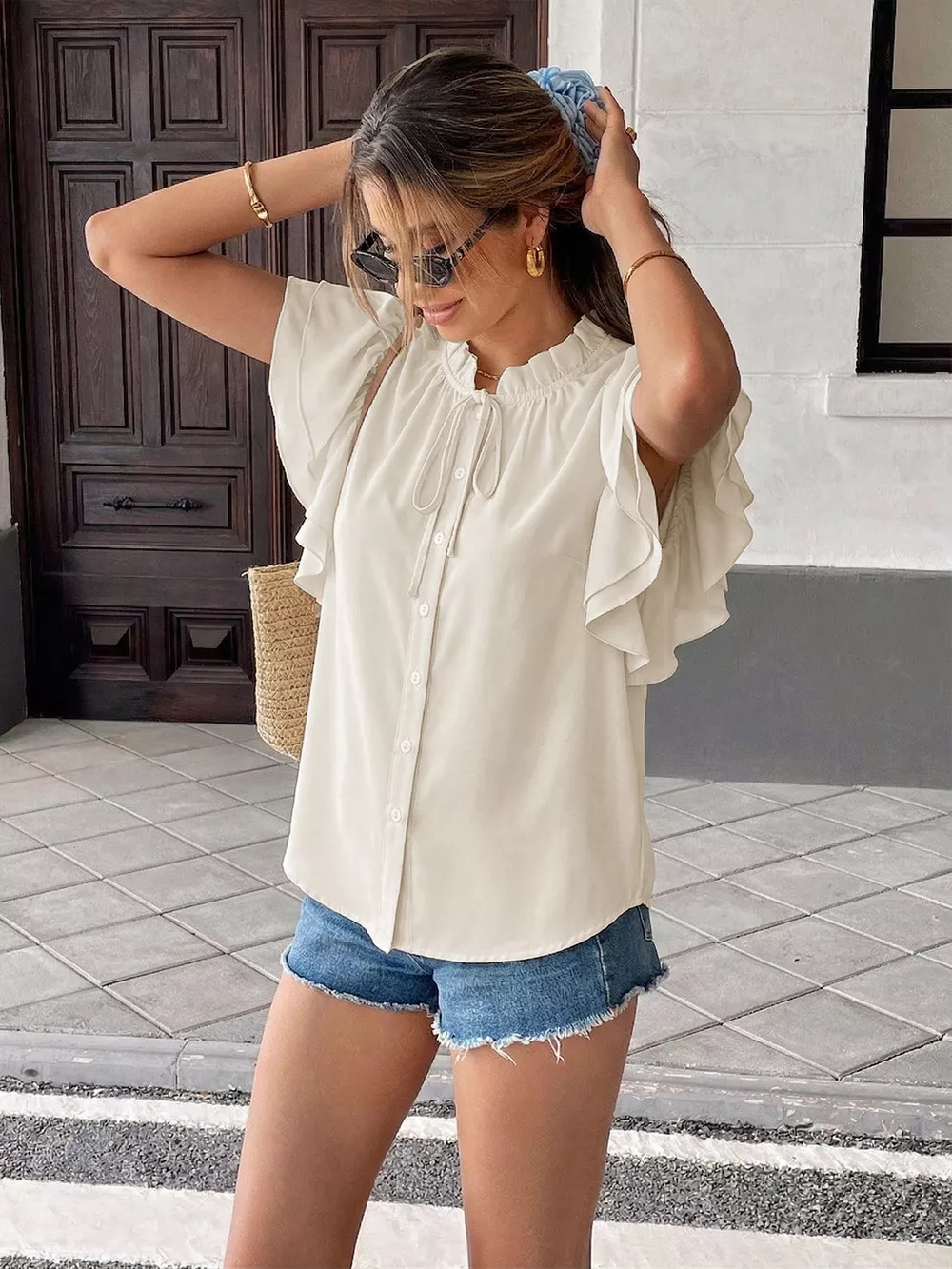 Ruffle Sleeve Tie-Neck Shirt