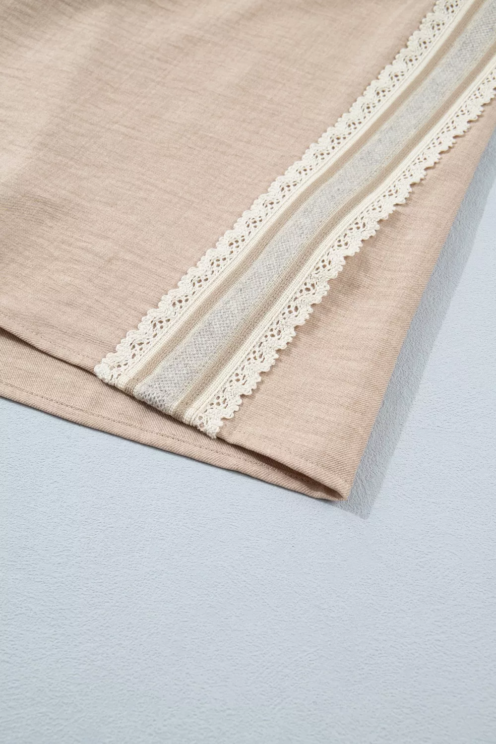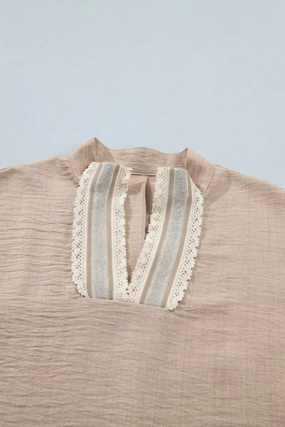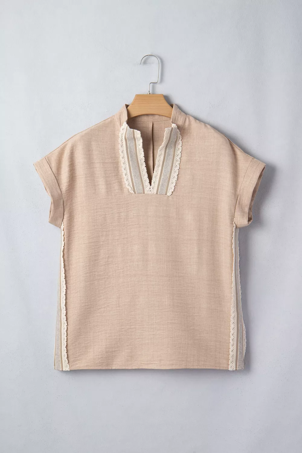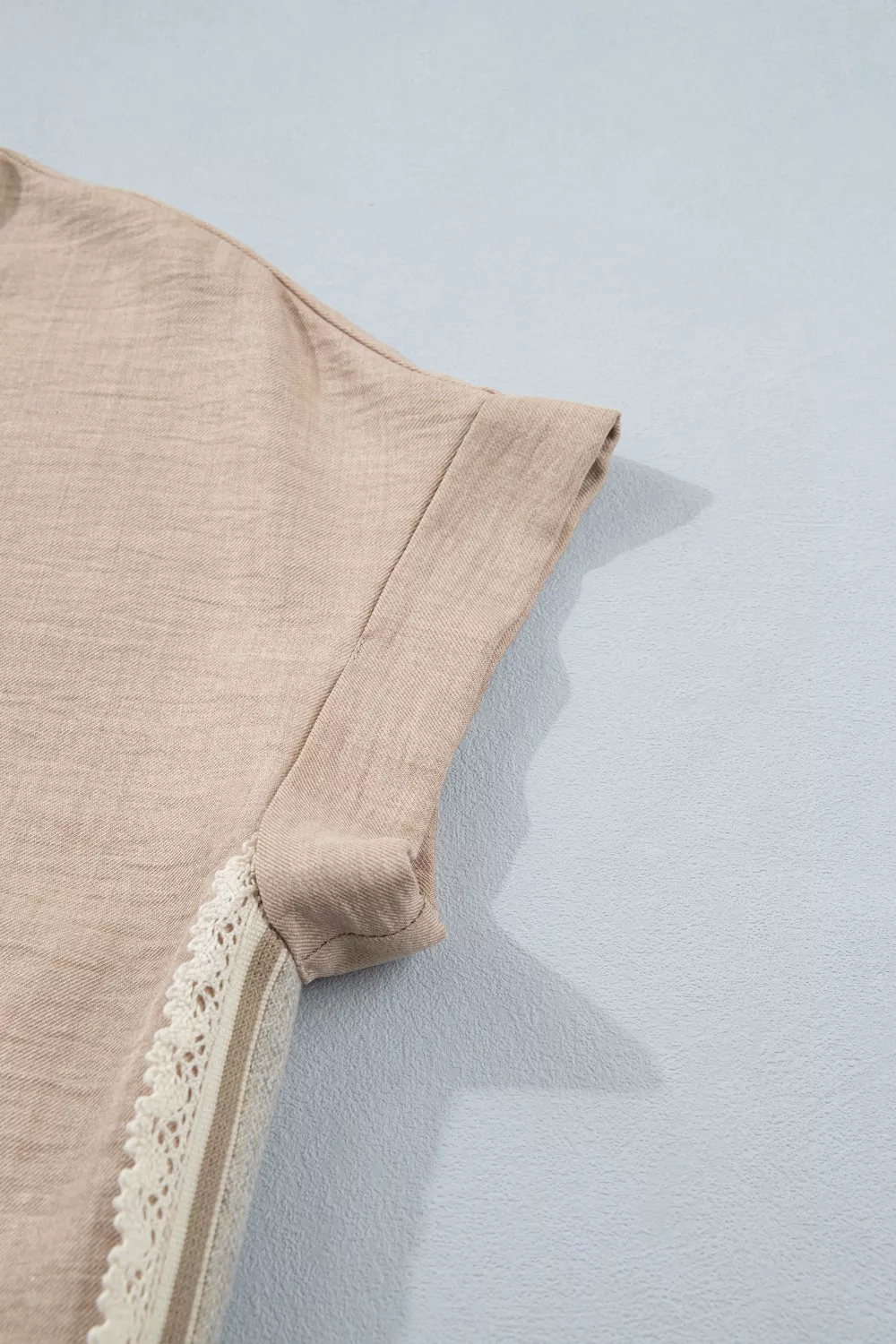 Crochet Lace Accent Pullover Rolled Short Sleeve Blouse