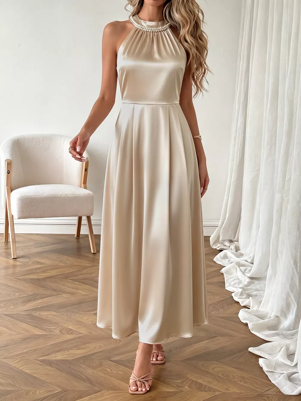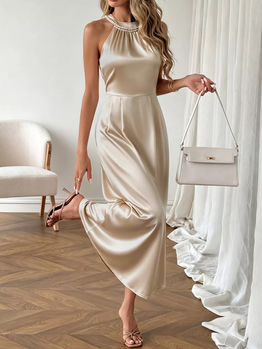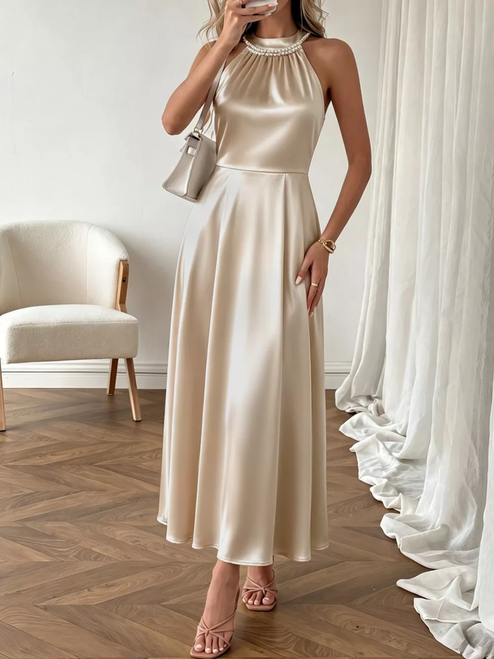 Pearl Halter Satin Midi Dress
