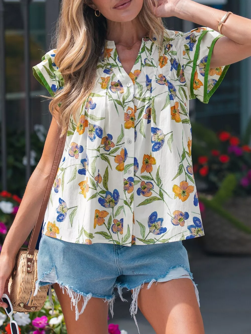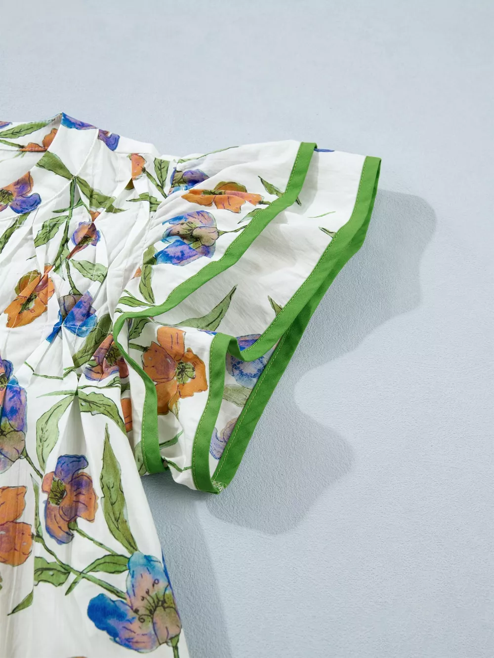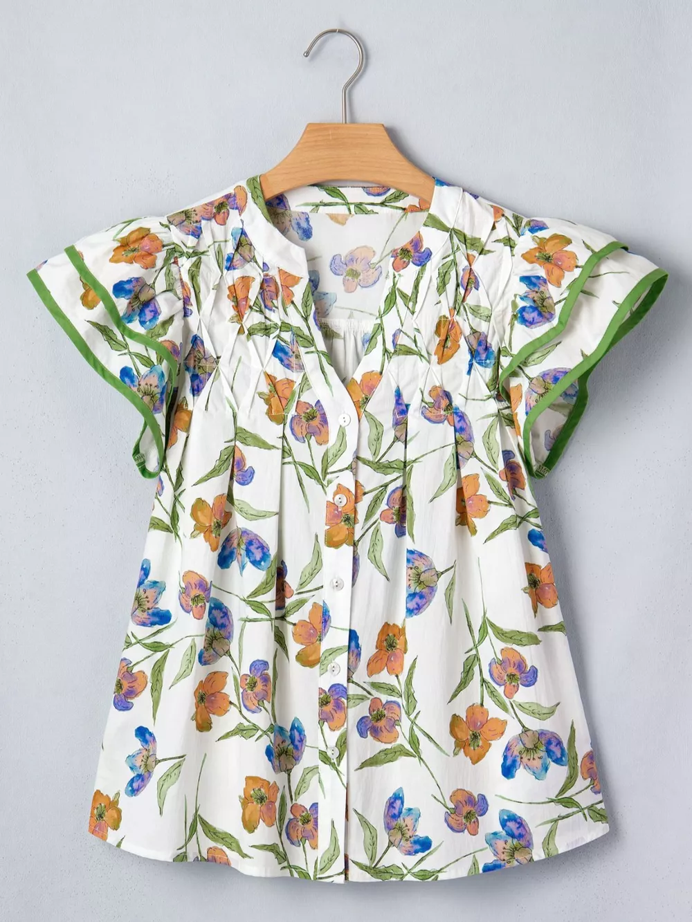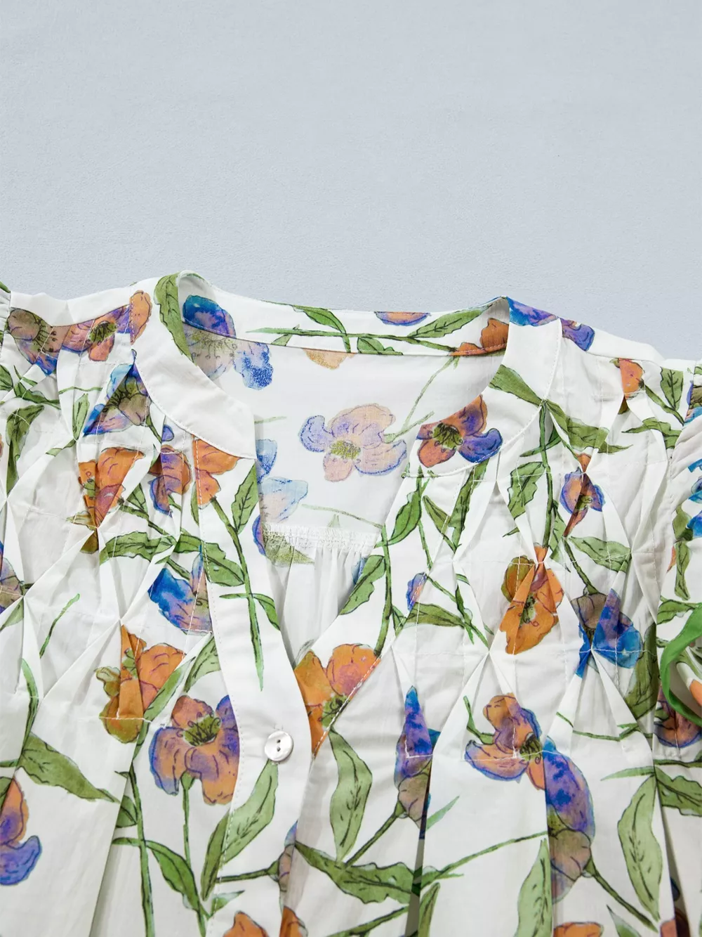Floral Print Ruffle V-Neck Pressed Pleats Binding Tape Cotton Blouse