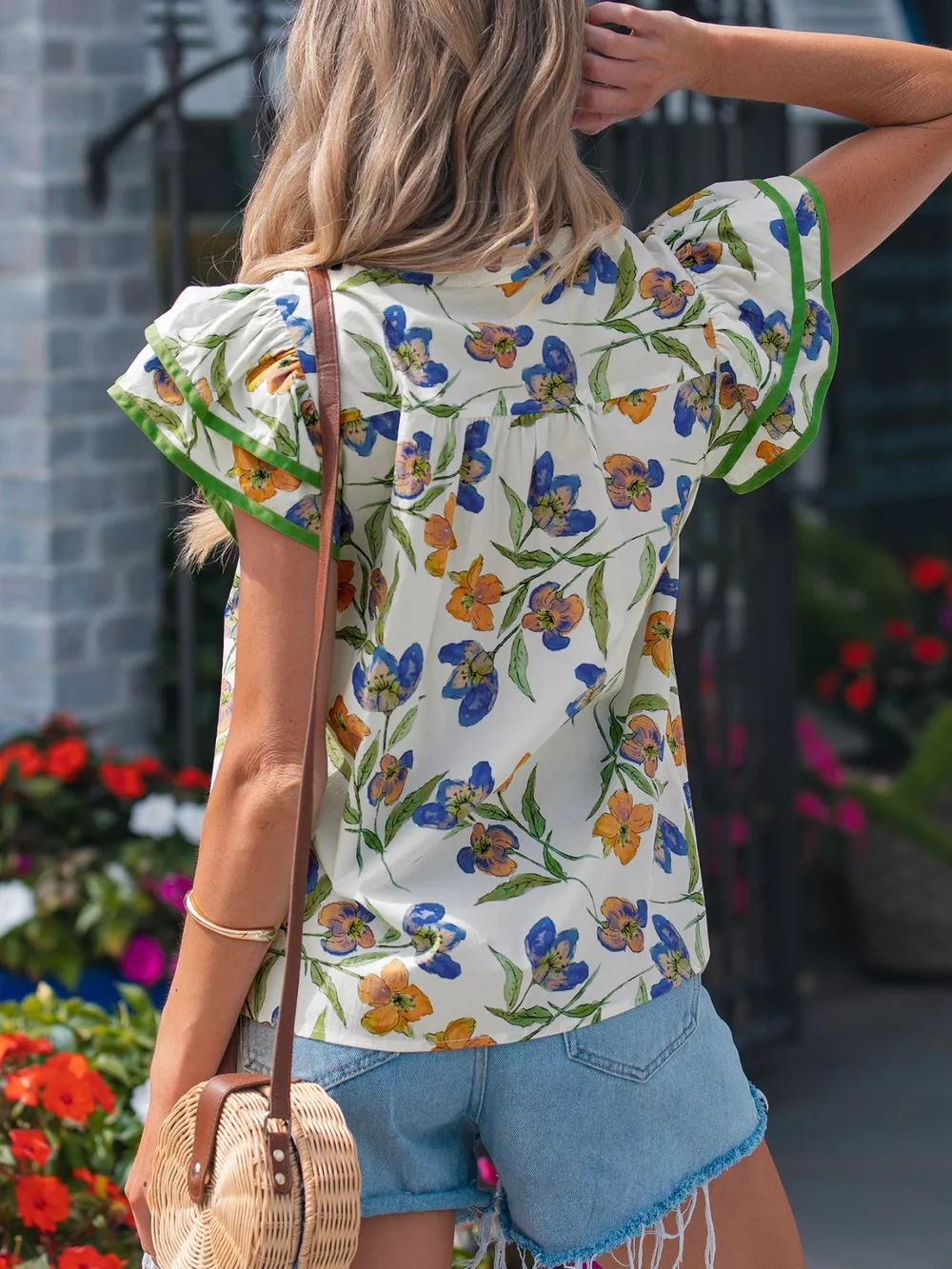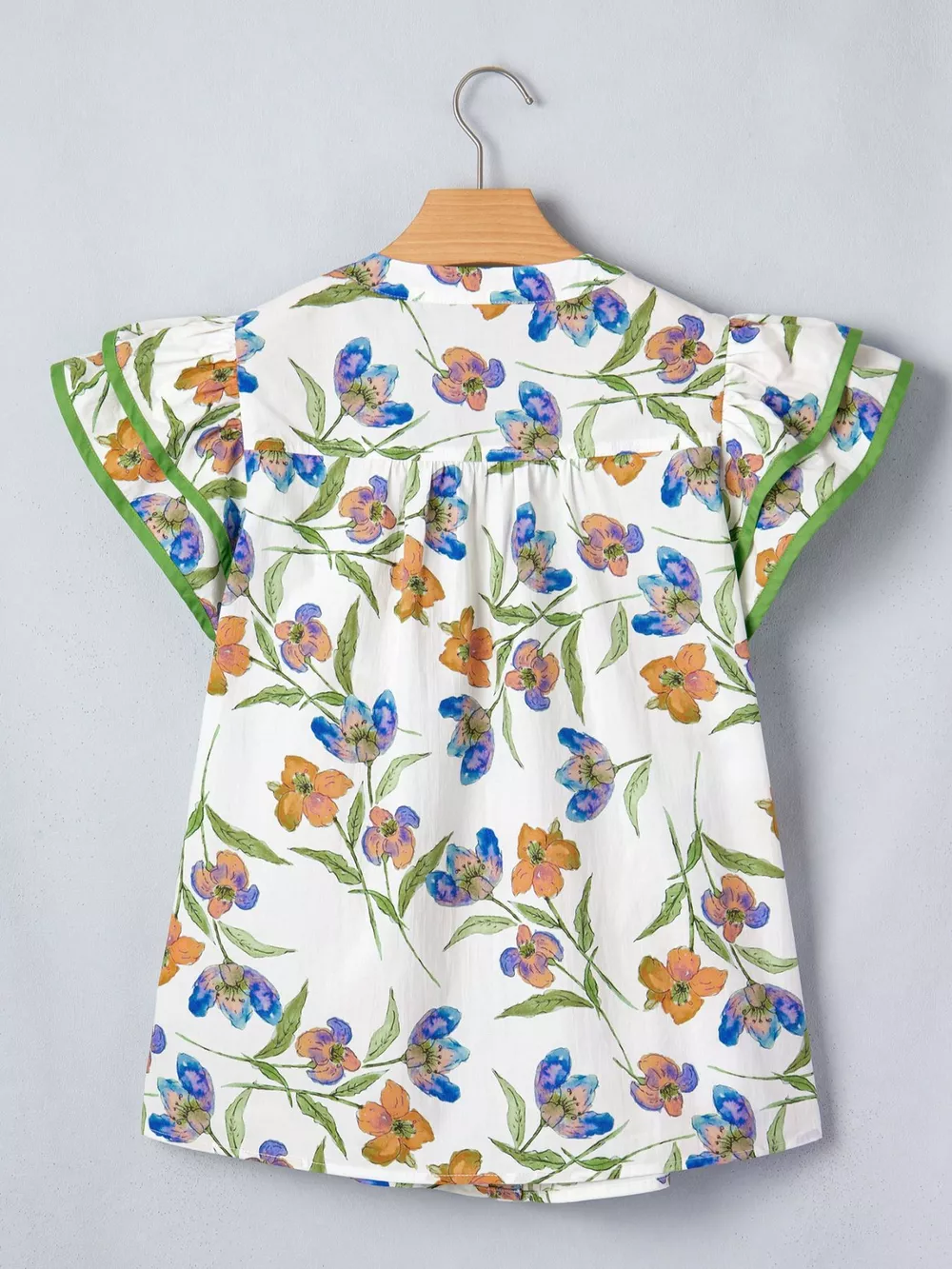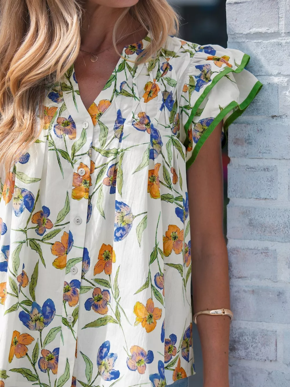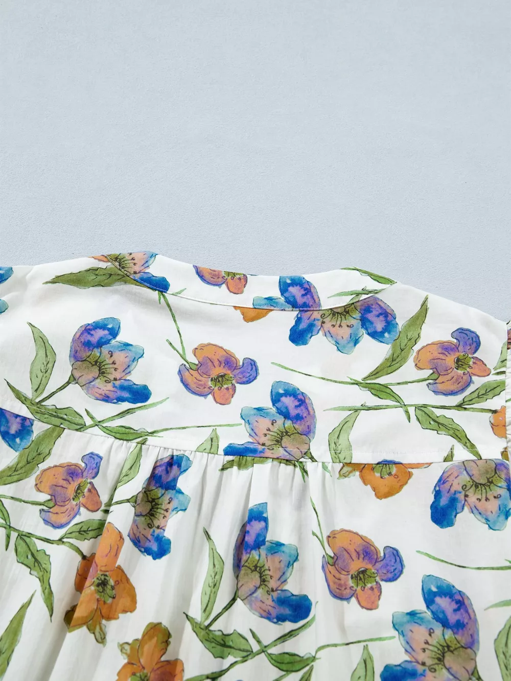 Floral Print Ruffle V-Neck Pressed Pleats Binding Tape Cotton Blouse