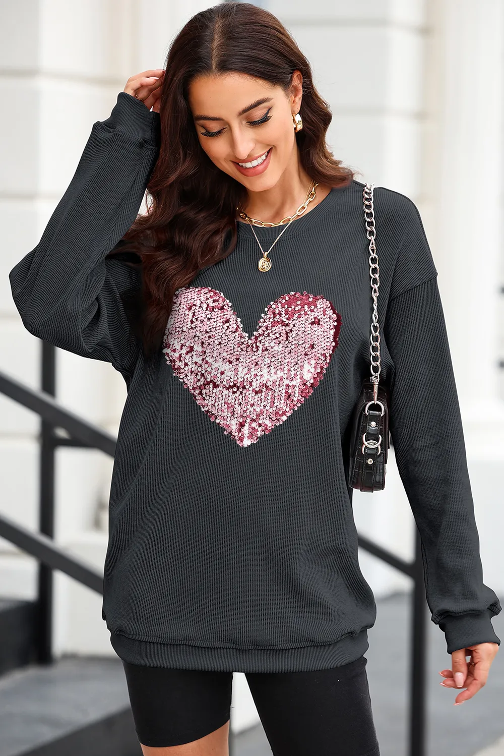 Detailed description of the Heart Sequin Round Neck Sweatshirt, highlighting quality, design, and unique features that make it appealing to end consumers.