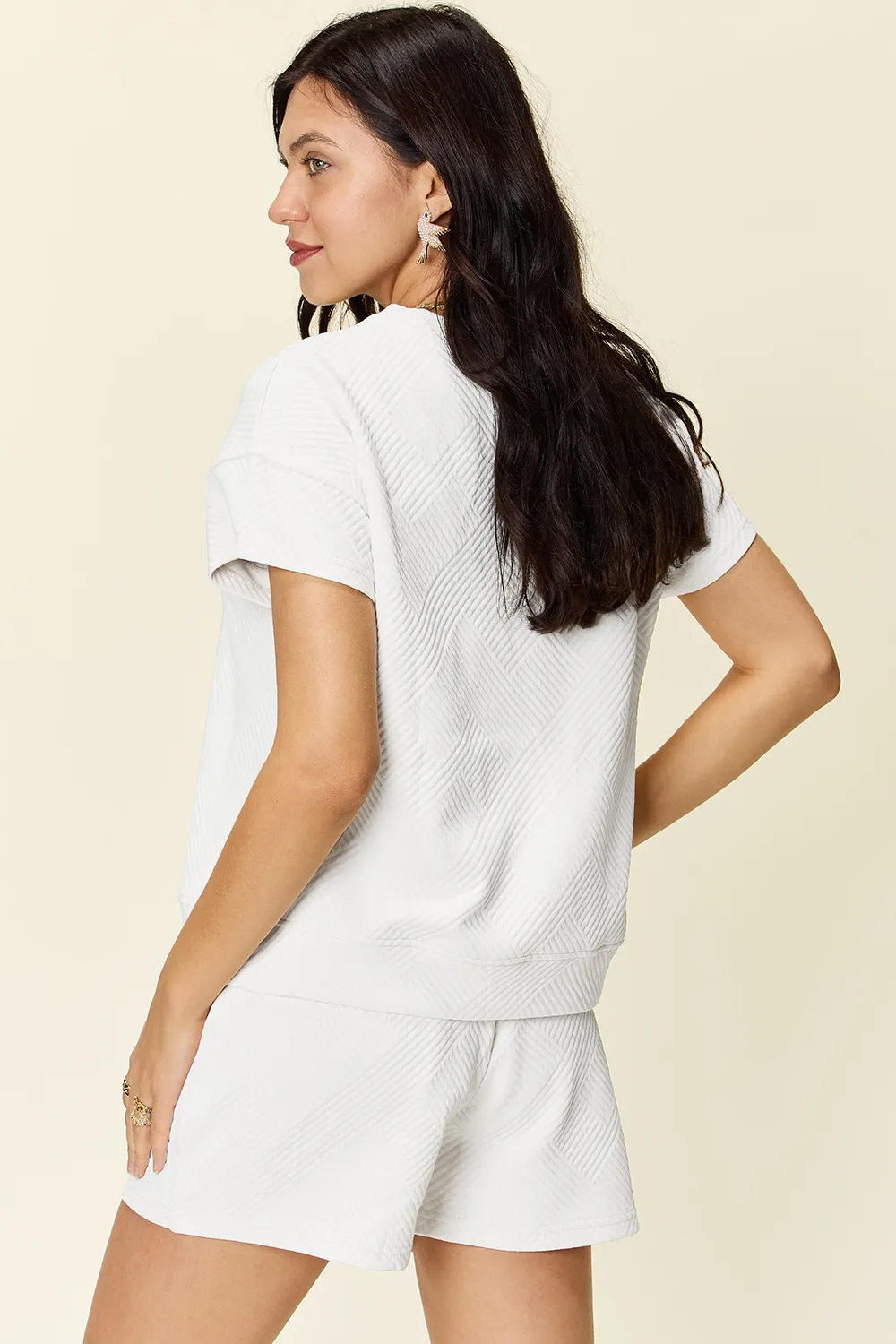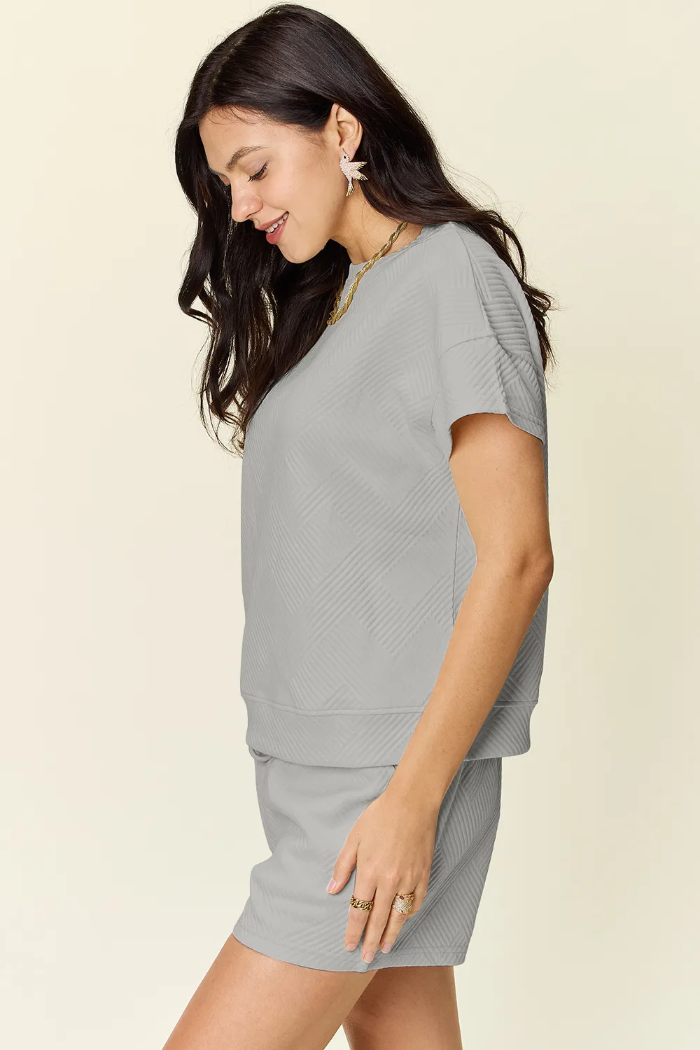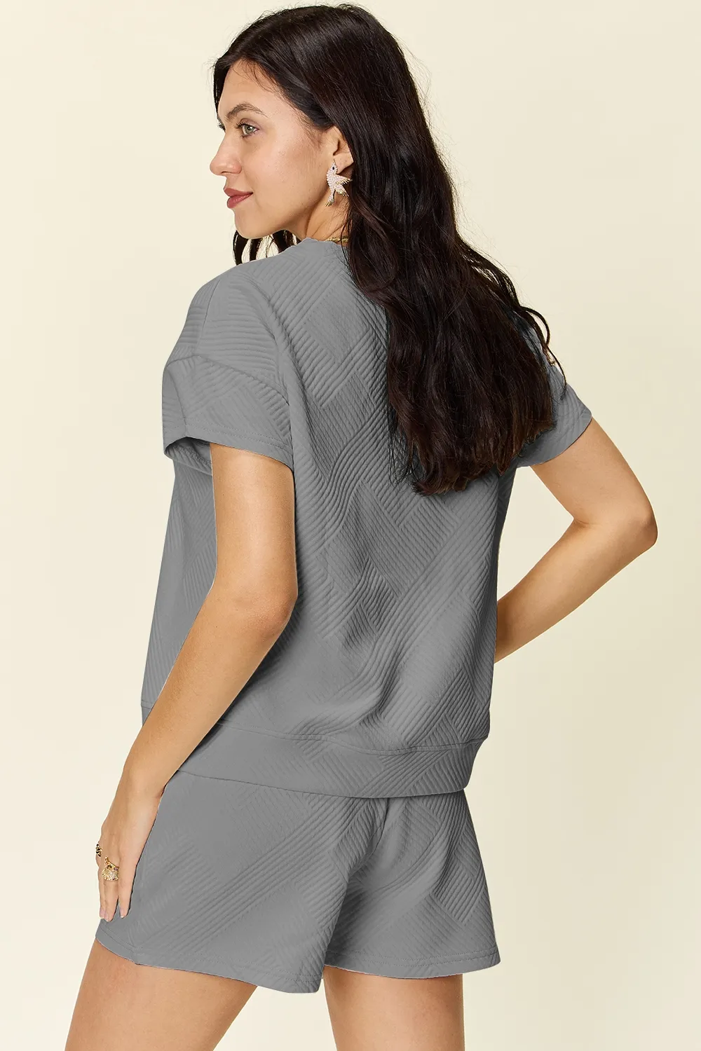Double Take Full Size Texture Short Sleeve T-Shirt and Drawstring Shorts Set