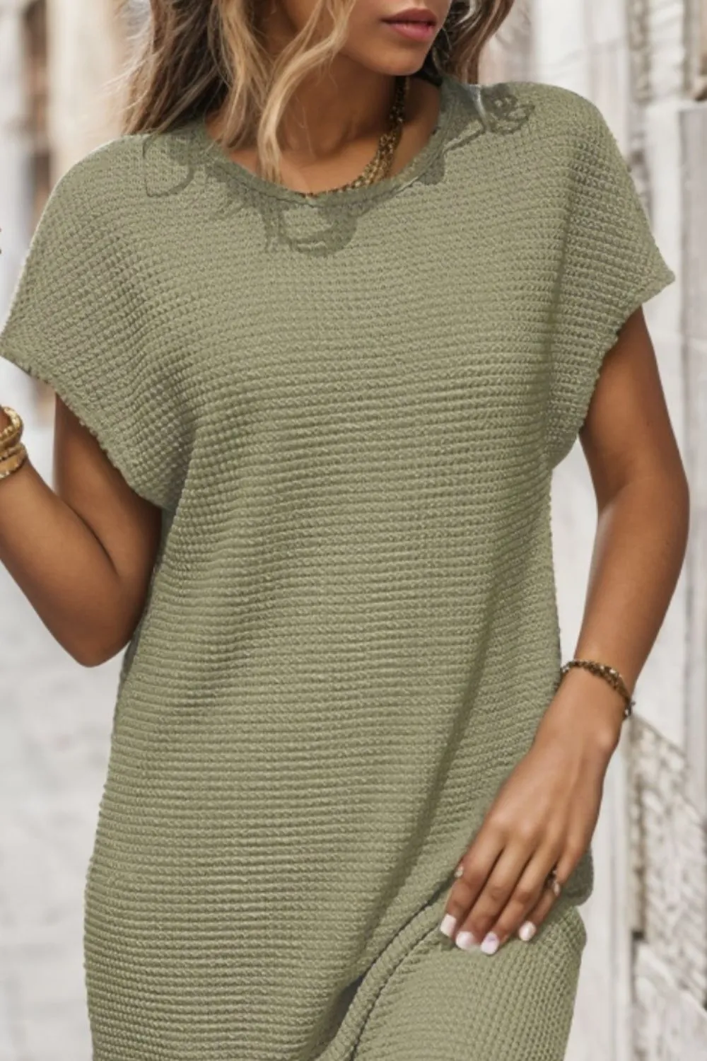 Waffle-Knit Cap Sleeve Knee Length Dress