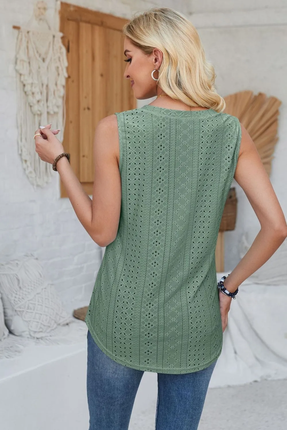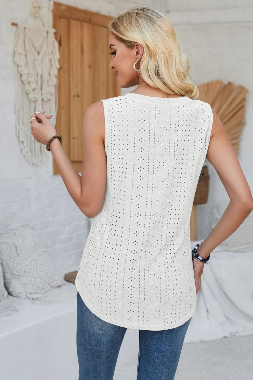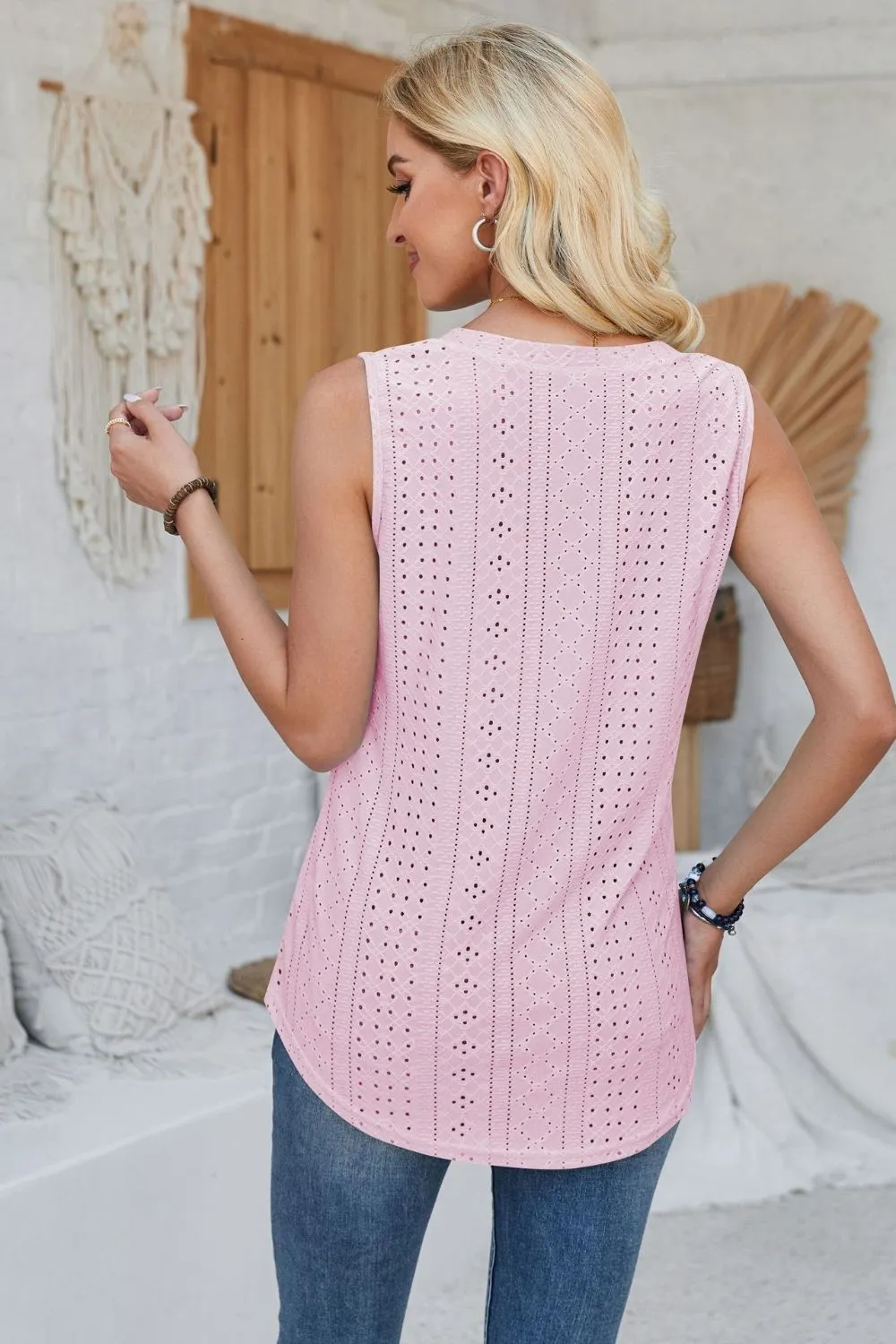 Detailed description of the Eyelet Decorative Button V-Neck Tank, highlighting quality, design, and unique features that make it appealing to end consumers.
