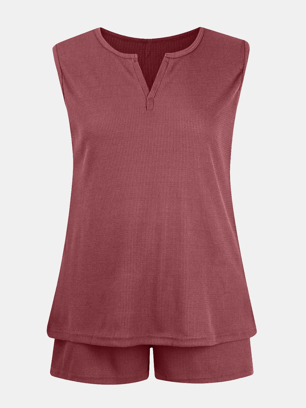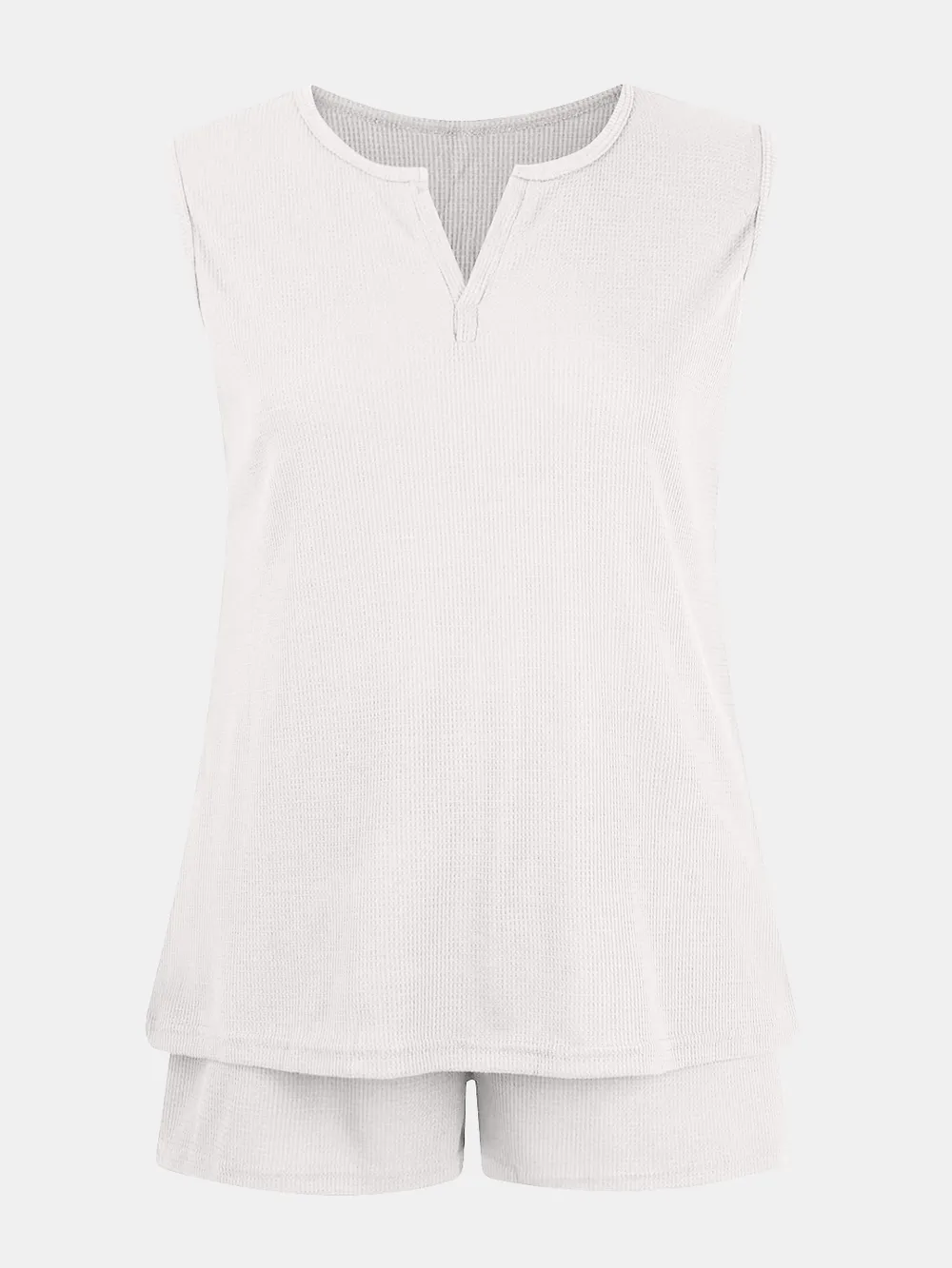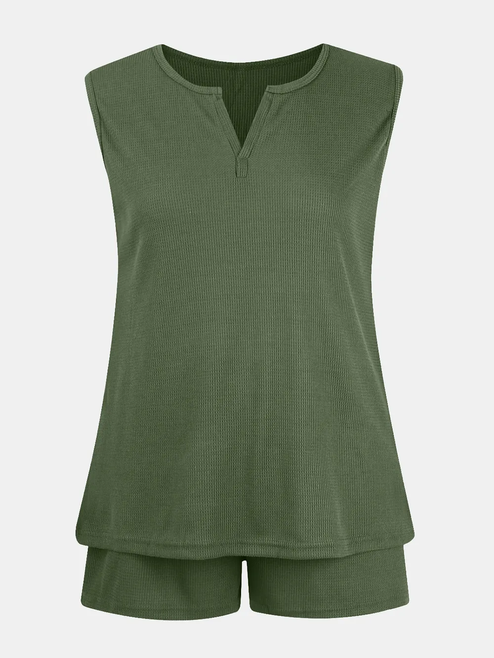 Full Size Waffle-Knit Notched Top and Shorts Set