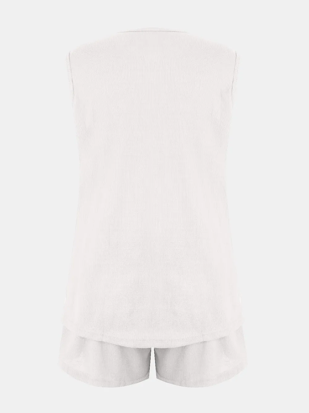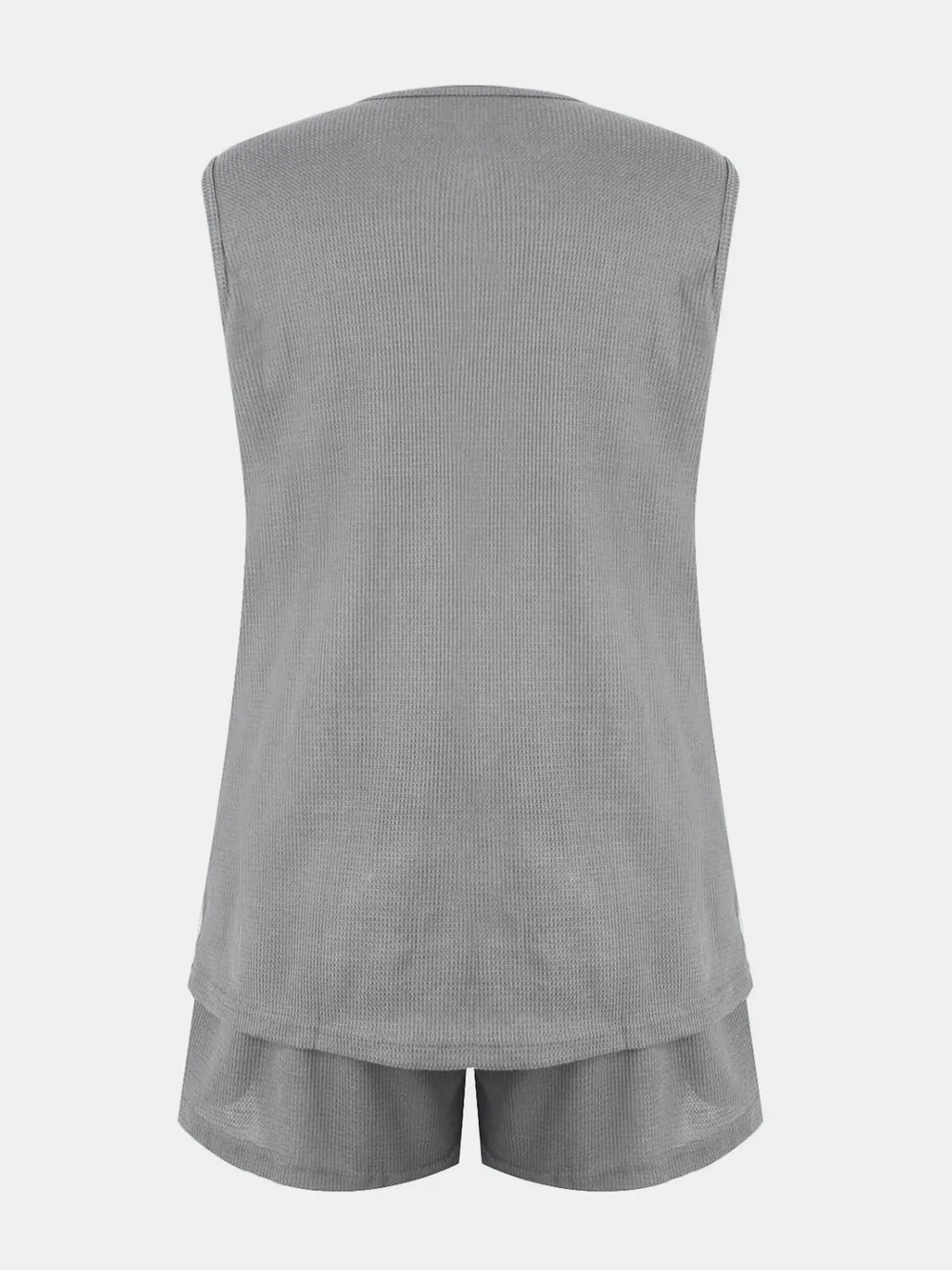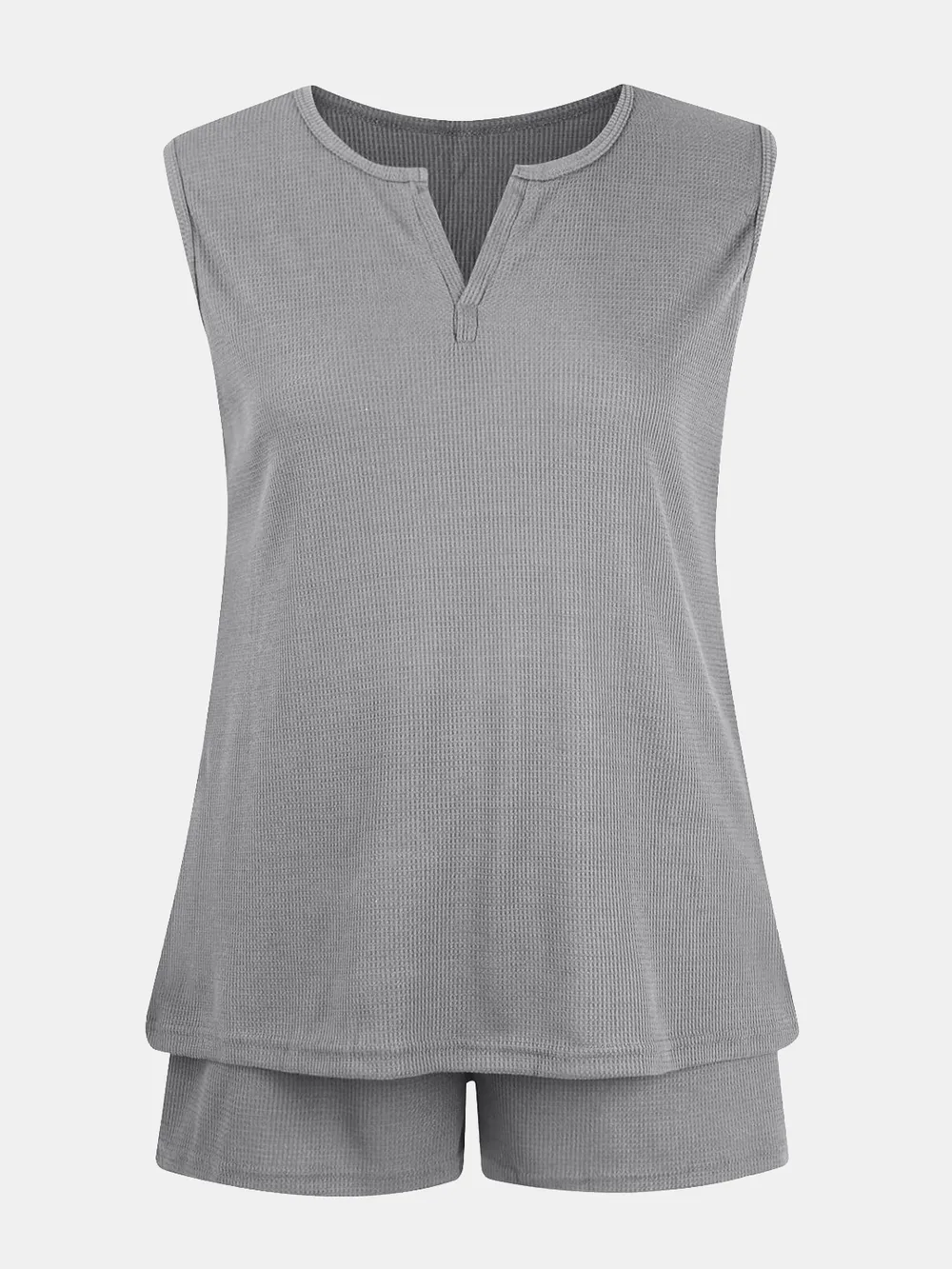 Full Size Waffle-Knit Notched Top and Shorts Set