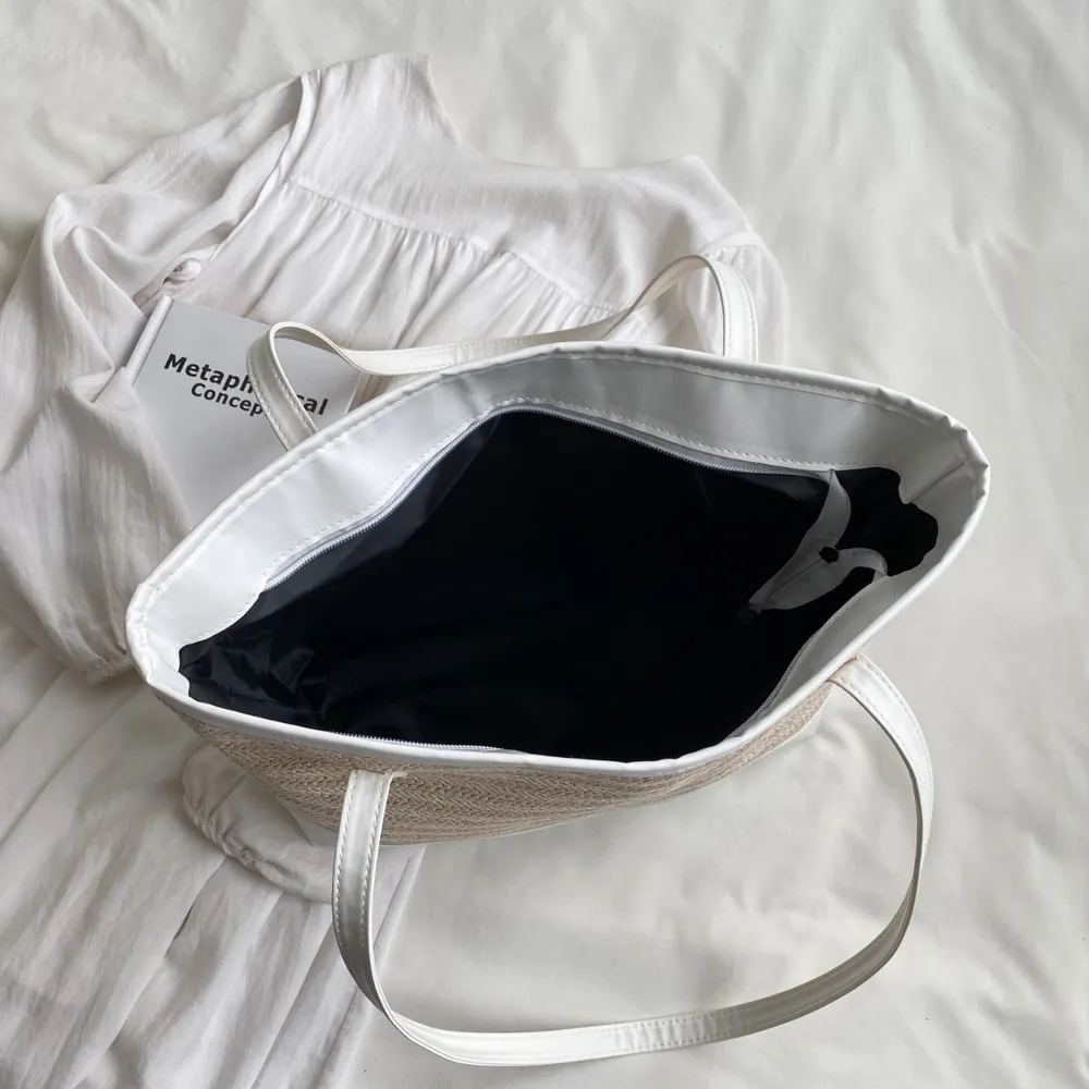 Detailed description of the Straw Weave Leather Strap Tote Bag, highlighting quality, design, and unique features that make it appealing to end consumers.
