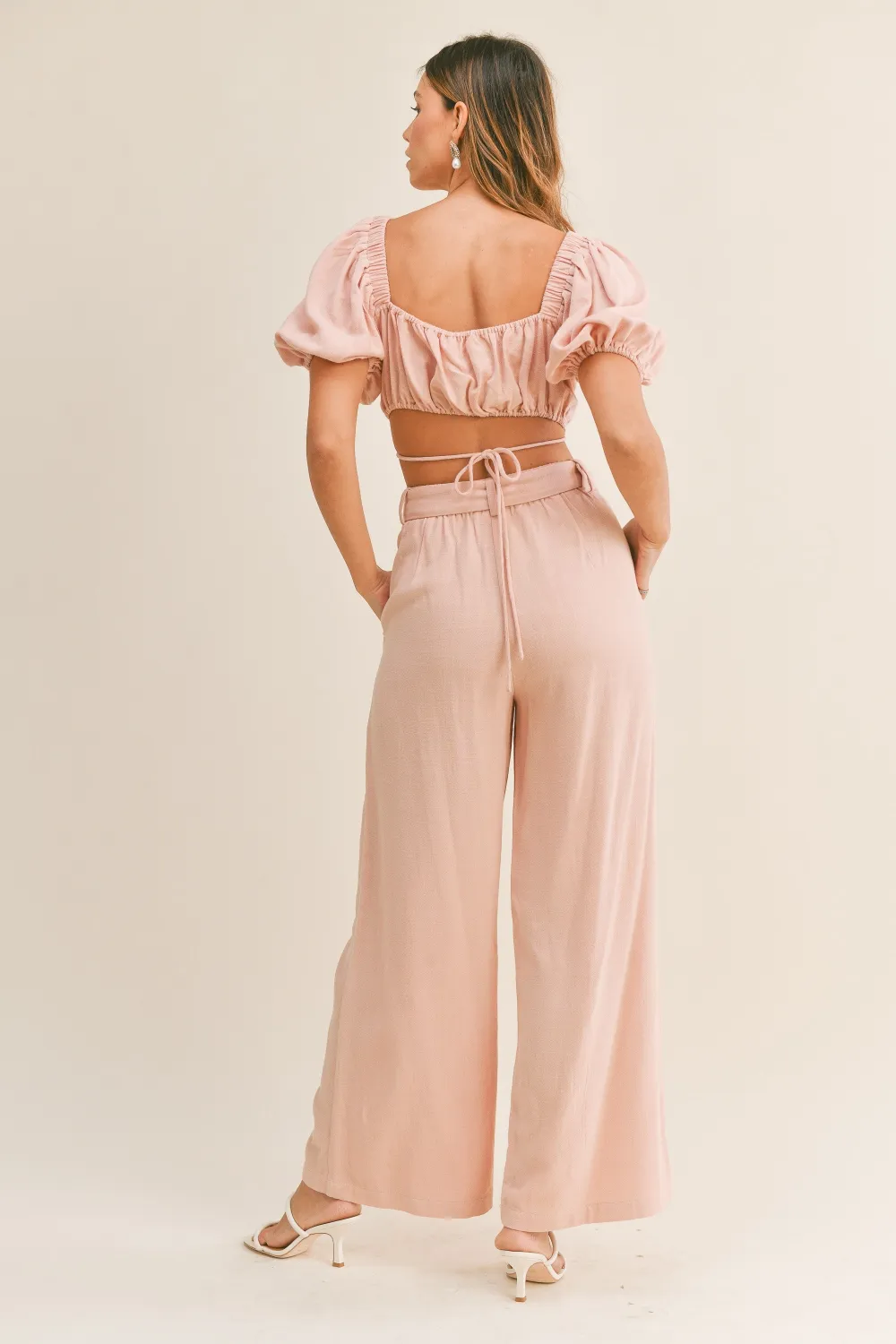 MABLE Cut Out Drawstring Crop Top and Belted Pants Set
